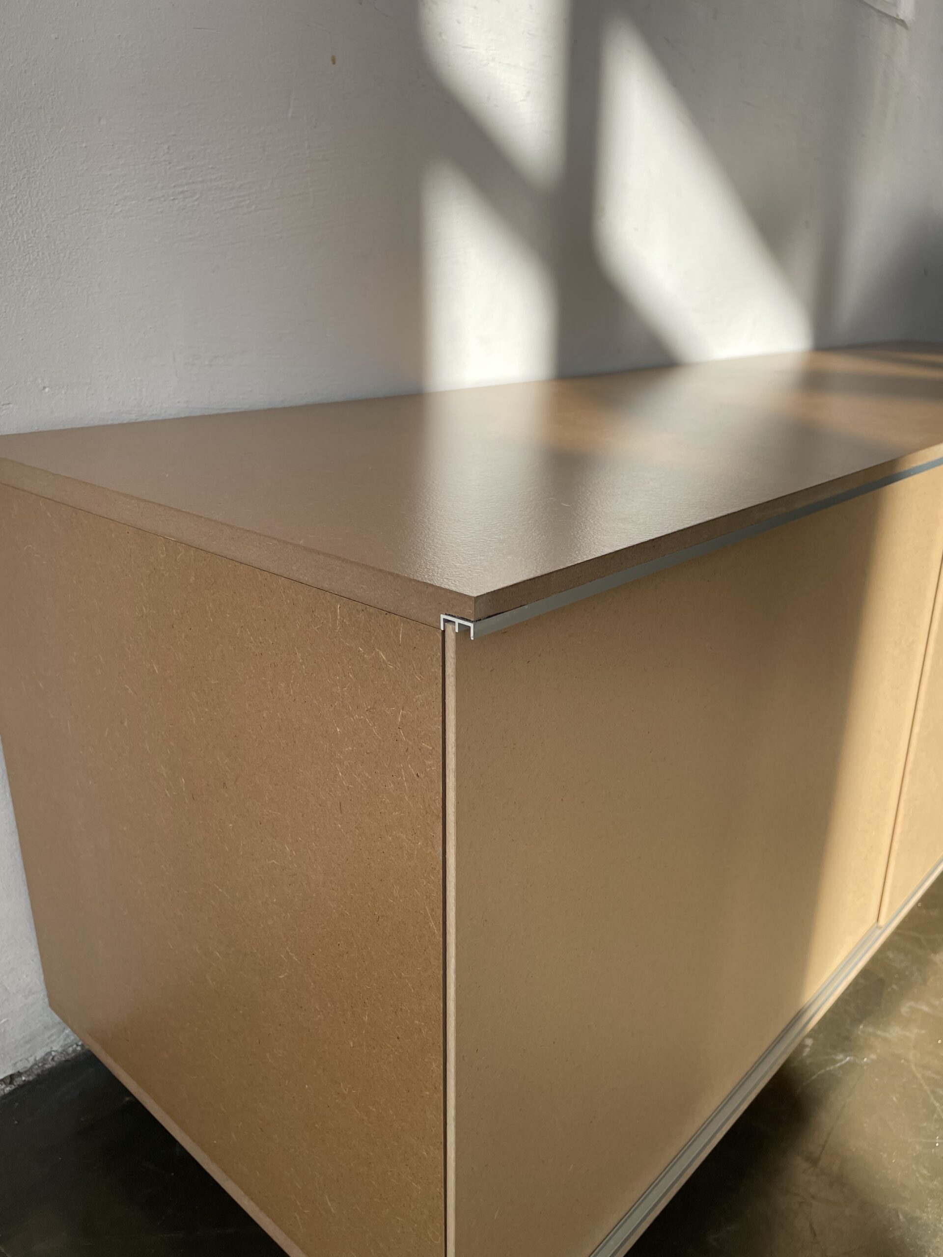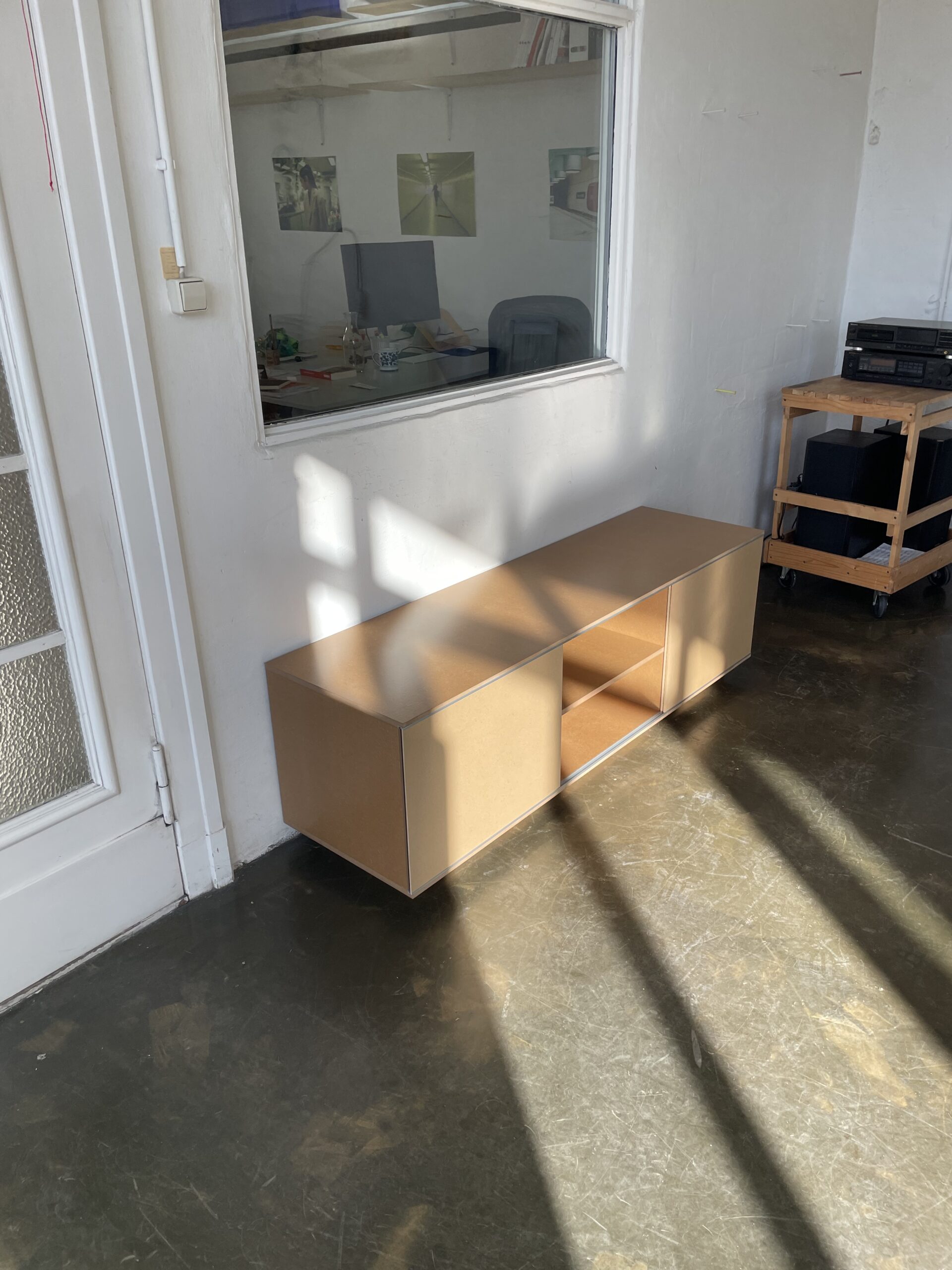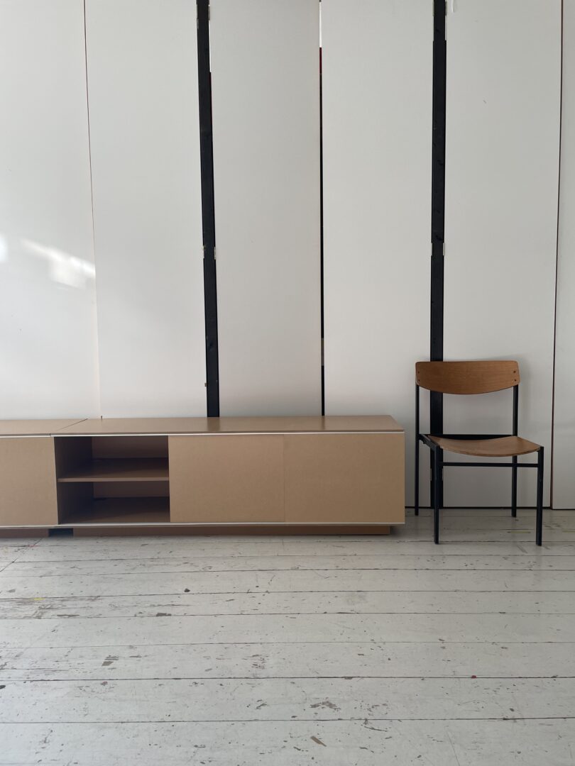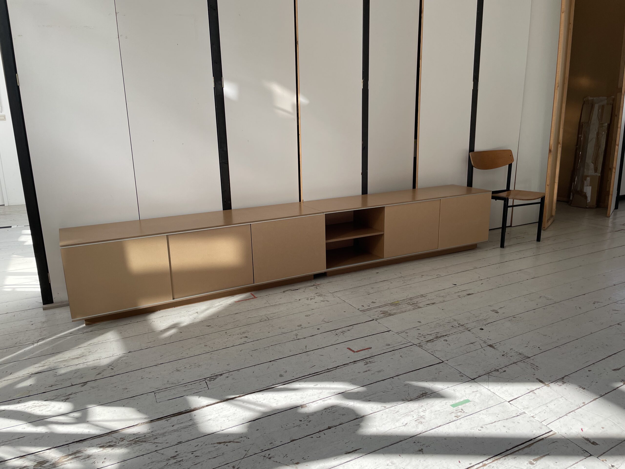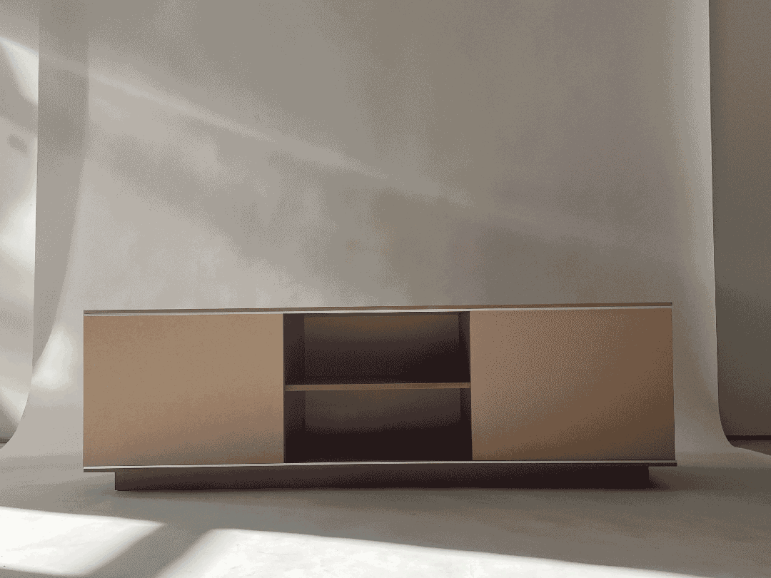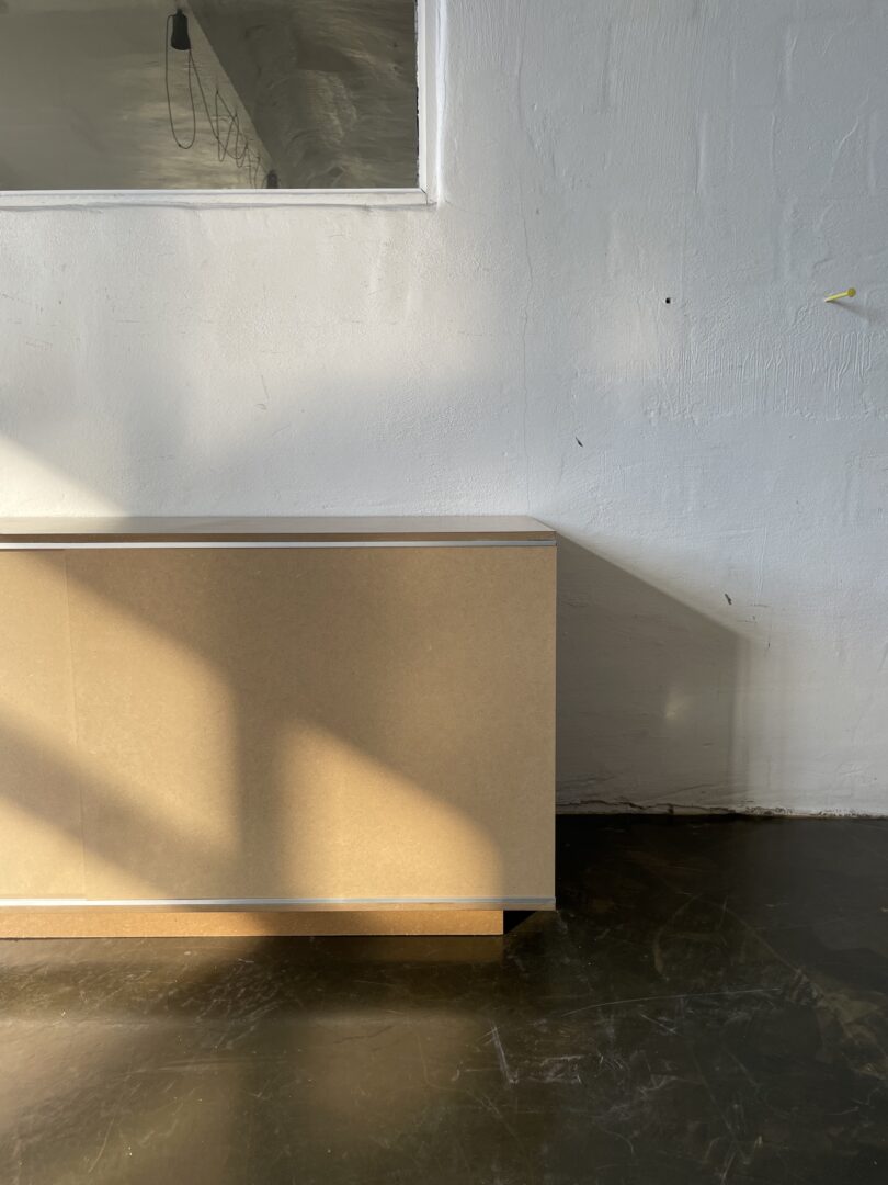 Since a while I’ve been experimenting with objects and furniture. This sideboard/ tv/ hifi furniture has been very fun to design and make. Each of the shelves and sections are connected, making it very easy for cables to pass through, and to avoid cable spaghetti! The lacked MDF gives it a beautiful warm golden colour and contrasts the colder aluminium guide rail which makes the doors open butter smooth. This one measures 160 x 50 cm and is 45 cm deep. Other size options are possible on request as well. This object is made to order so please contact info@modem.studio with your request.